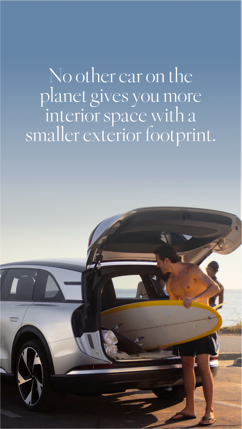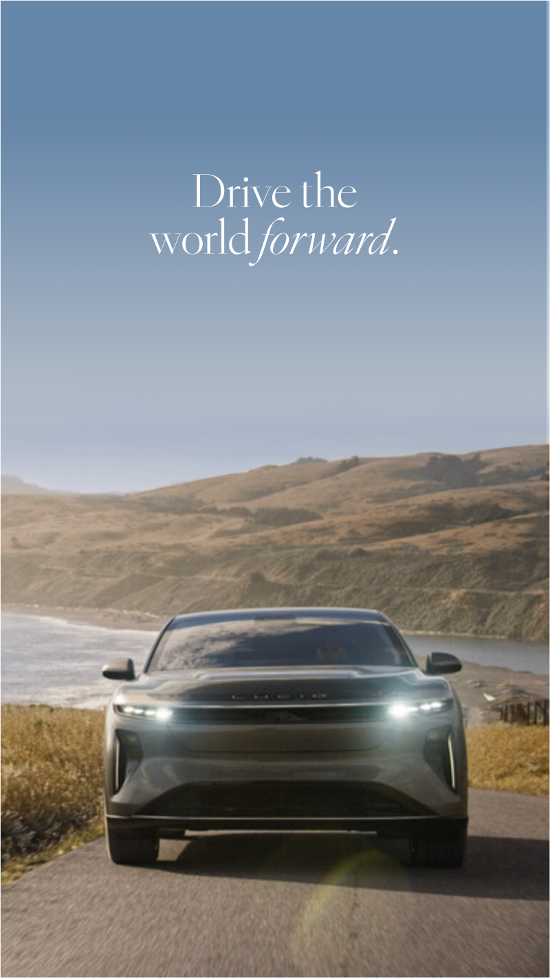 WE POSITIONED LUCID AS THE FIRST BRAND TO MAKE EVS SIMPLE TO UNDERSTAND AND INSPIRING TO EMBRACE. THROUGH CLEAR STORYTELLING, WE DISPELLED MISCONCEPTIONS, HIGHLIGHTED THE ENVIRONMENTAL BENEFITS OF EV ADOPTION, AND SHOWCASED HOW LUCID OUTSHINES THE COMPETITION. THE CAMPAIGN WAS UNIFIED THROUGH A BLUE GRADIENT TONE, A VISUAL CUE FOR SUSTAINABILITY AND PROGRESS — PAIRED WITH A GRAPHIC SYSTEM DESIGNED TO MAKE COMPLEX TECHNOLOGY EASILY UNDERSTOOD. TOGETHER, THESE ELEMENTS ESTABLISHED LUCID AS THE OBVIOUS LEADER DRIVING THE WORLD FORWARD.